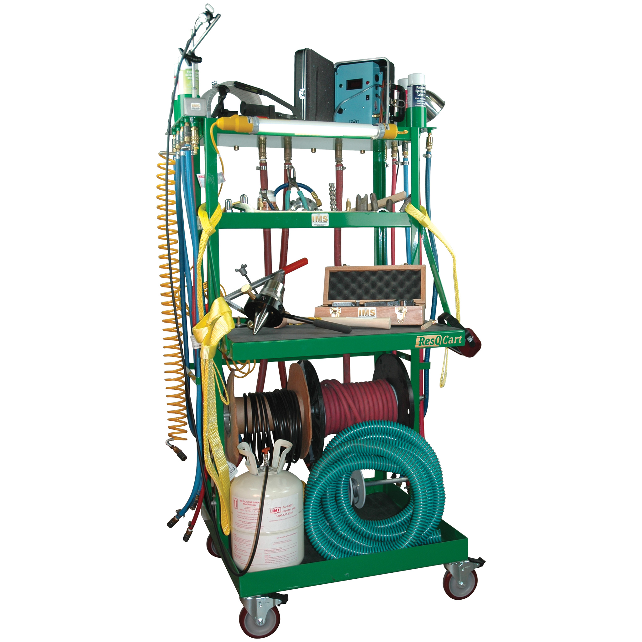 Mold Maintenance And Set-Up Cart. All Welded Steel Construction, Painted Green And 4 Swivel Locking Casters. Includes 3 Storage Shelves, 1 Work Bench Shelf, Hose, Wire, And Tubing Rod Support Slots, Nozzle Tip/Tool Tray, Aerosol Can Holder, Unique Preassembled Hose/Fitting Holders.