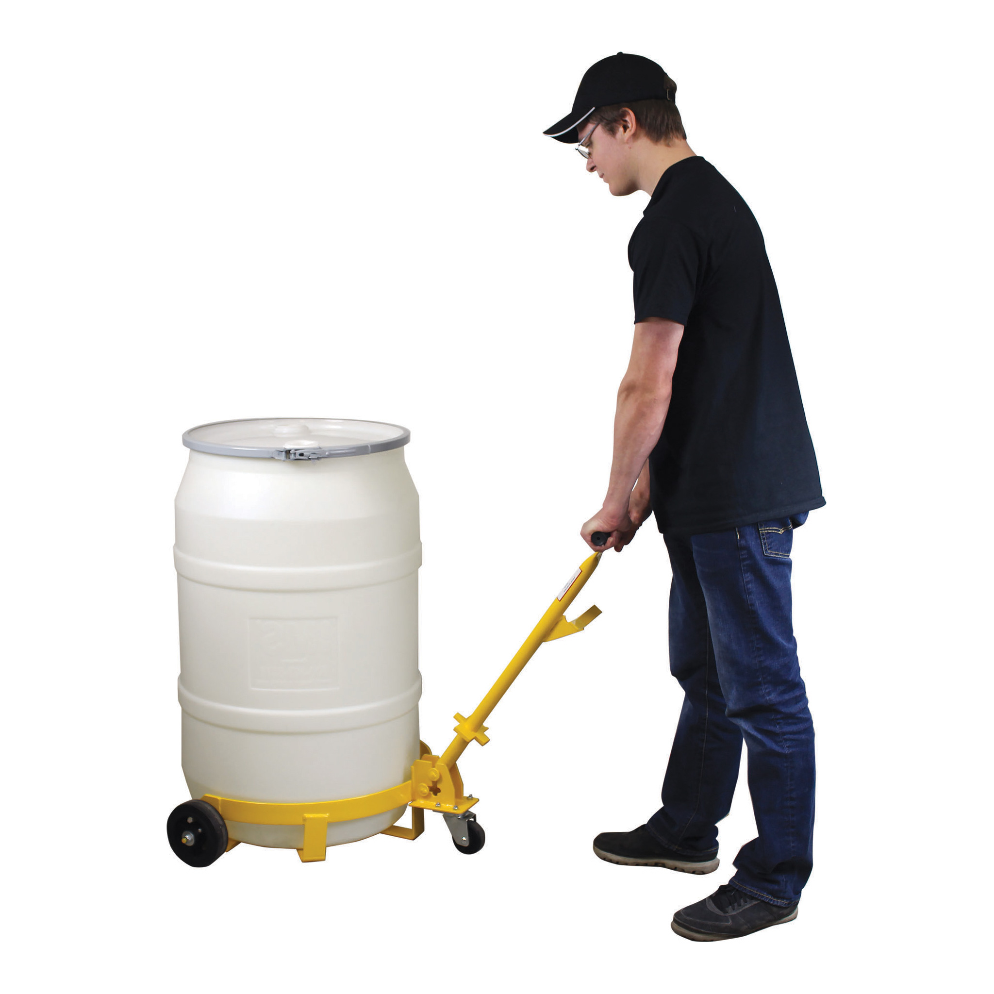 Lo-Profile Drum Caddy For 30 To 55 Gallon Plastic Or Steel Drums, Low Profile Design, Welded All Steel Construction And Yellow Powder Coated Finish. Includes Built In Bung Wrench And Seal Remover With Removable Handle For Drum Tilting.